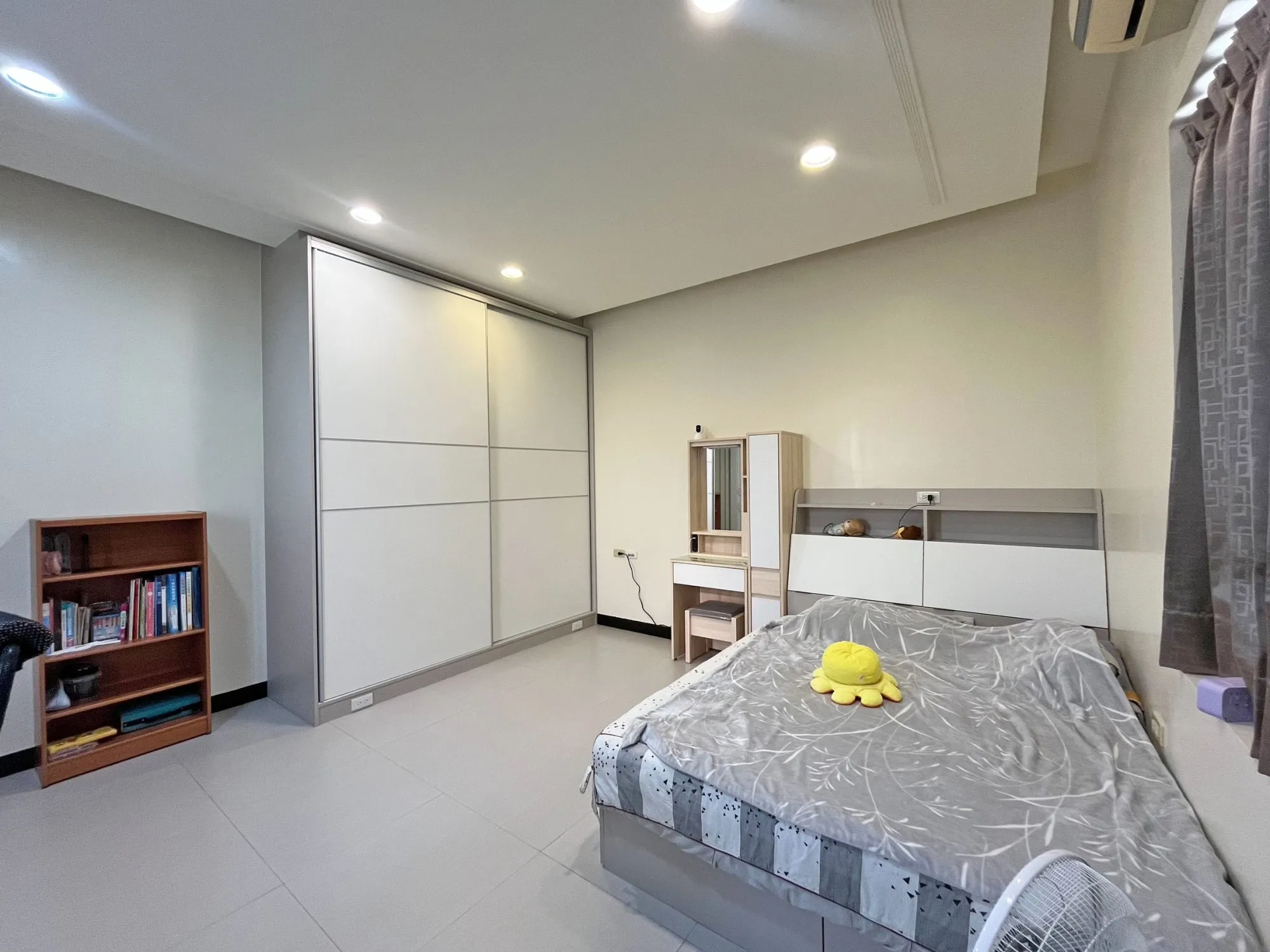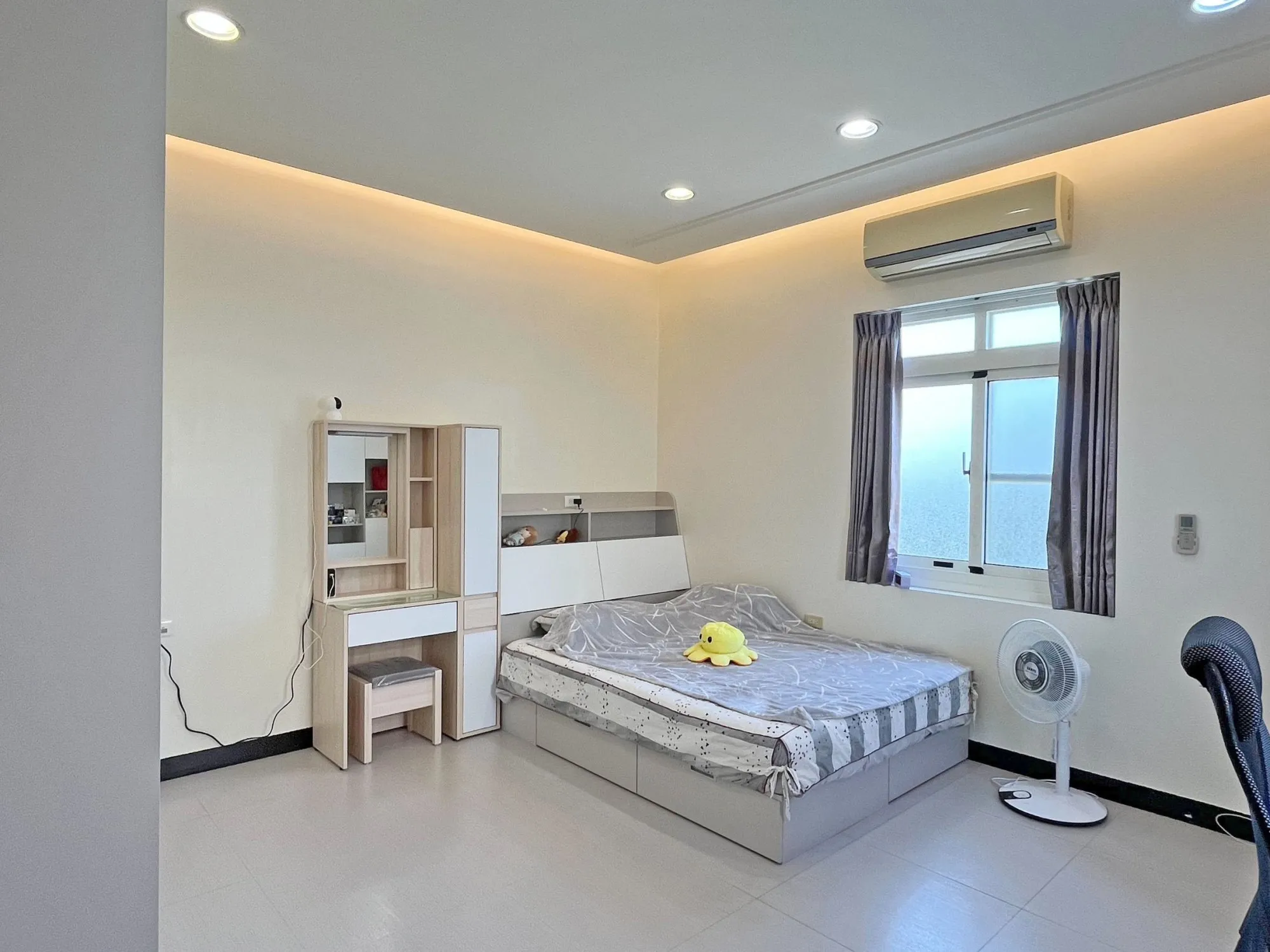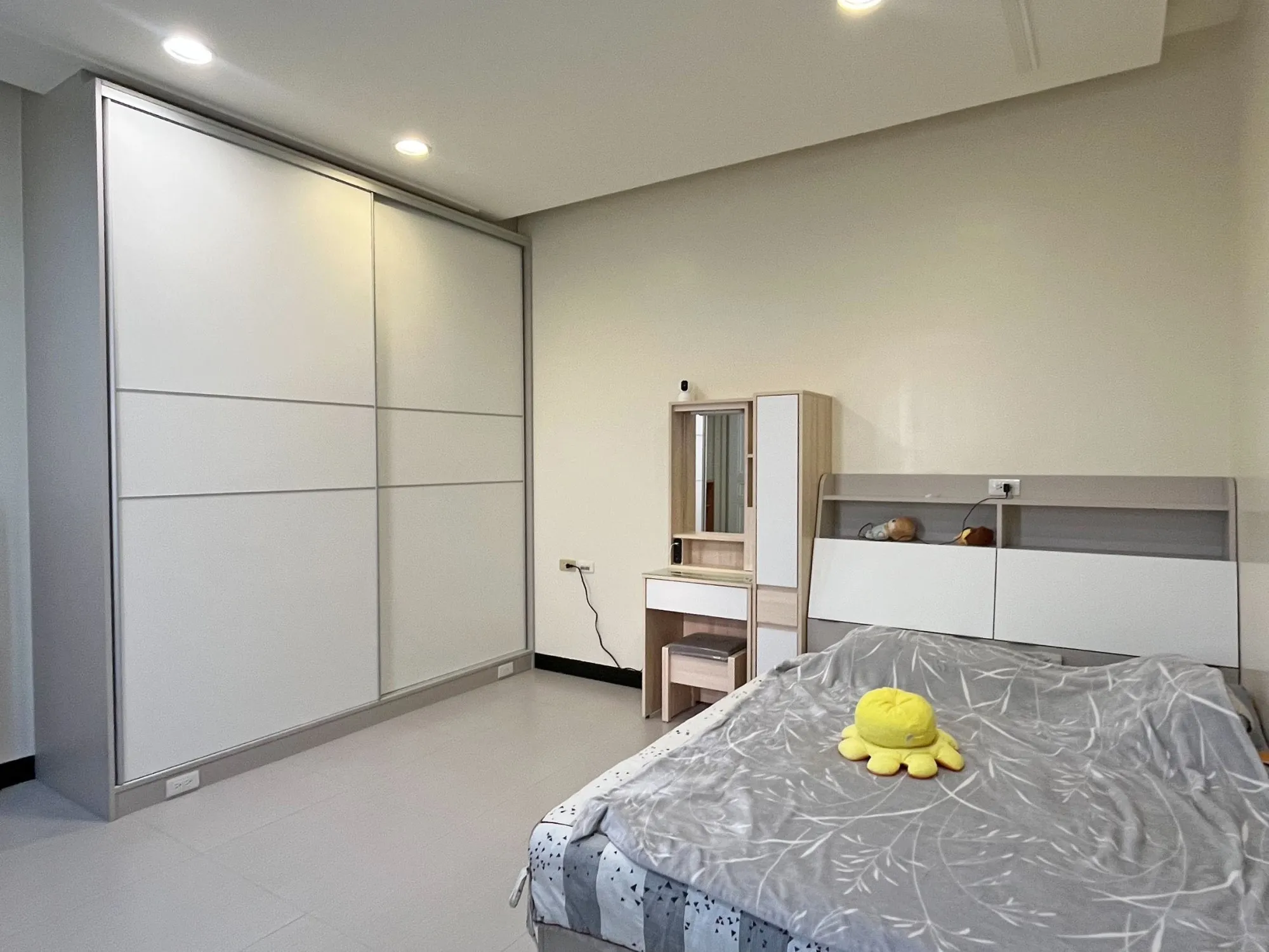 保留寬敞的活動空間,原有化妝台傢俱也妥善納入整體規劃中,讓空間看起來更有餘裕,也更加順眼協調。